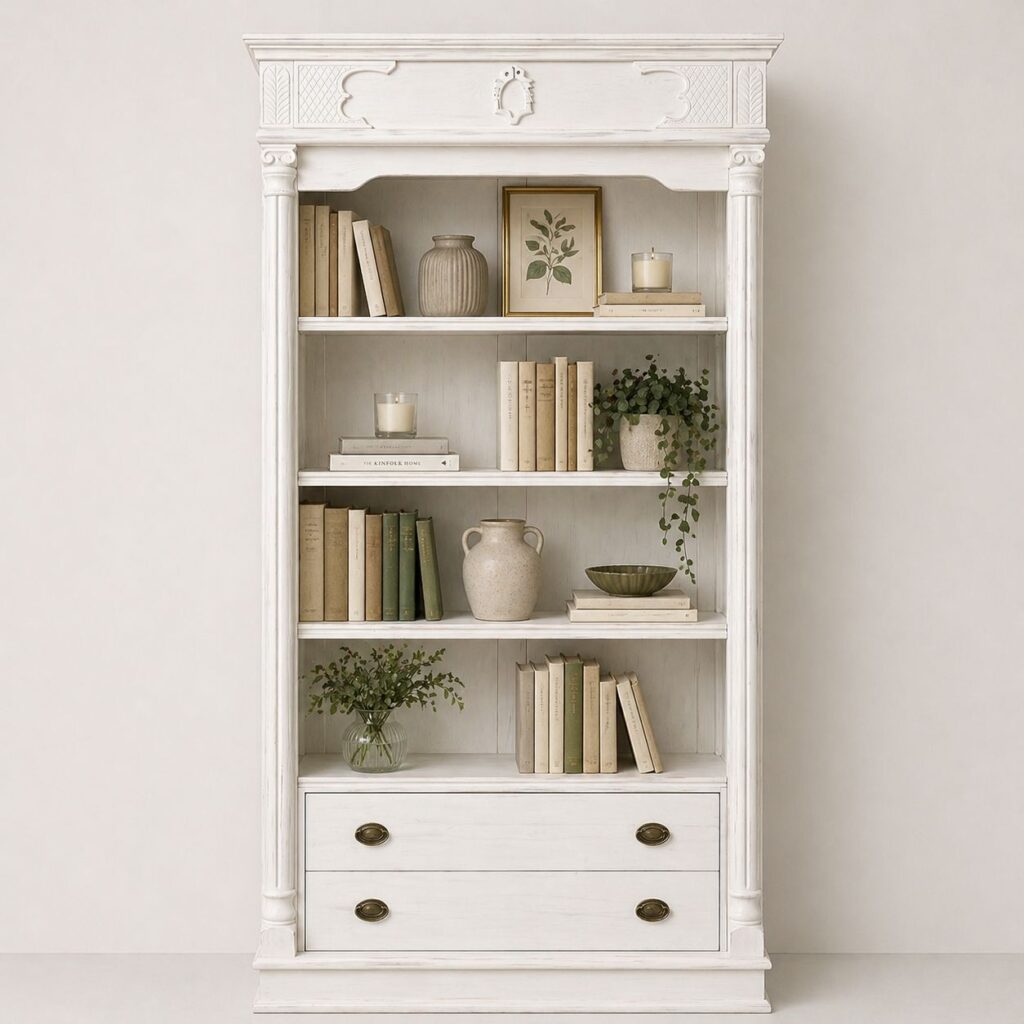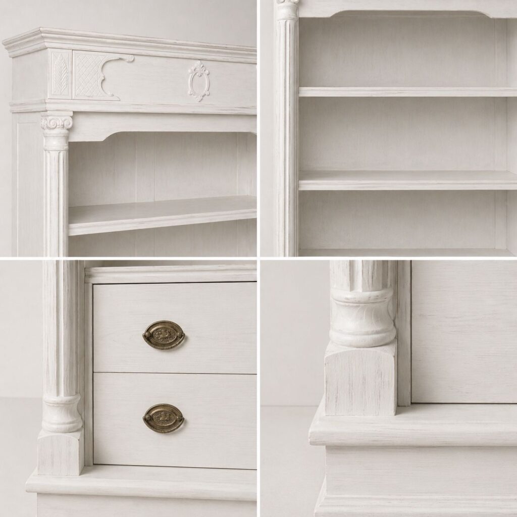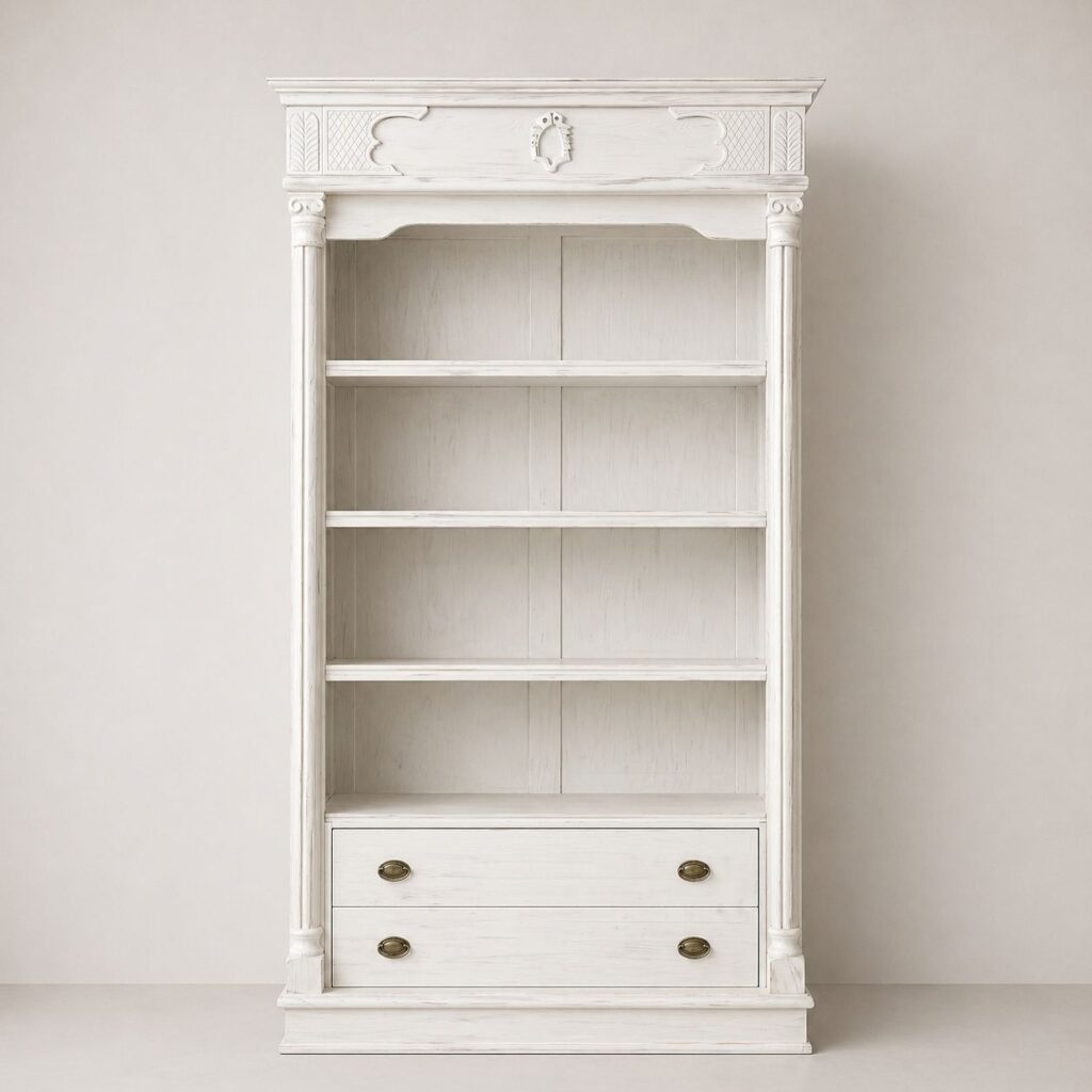 La Estantería Oria es una pieza de gran presencia concebida para aportar carácter y equilibrio a espacios de estilo natural. Su estructura combina estantes abiertos con dos cajones inferiores, ofreciendo una solución funcional para organizar y exponer objetos decorativos con coherencia estética. Las líneas clásicas, junto con los detalles tallados y las columnas laterales, refuerzan su personalidad y la convierten en un mueble protagonista dentro de cualquier estancia.