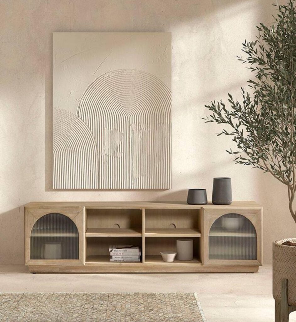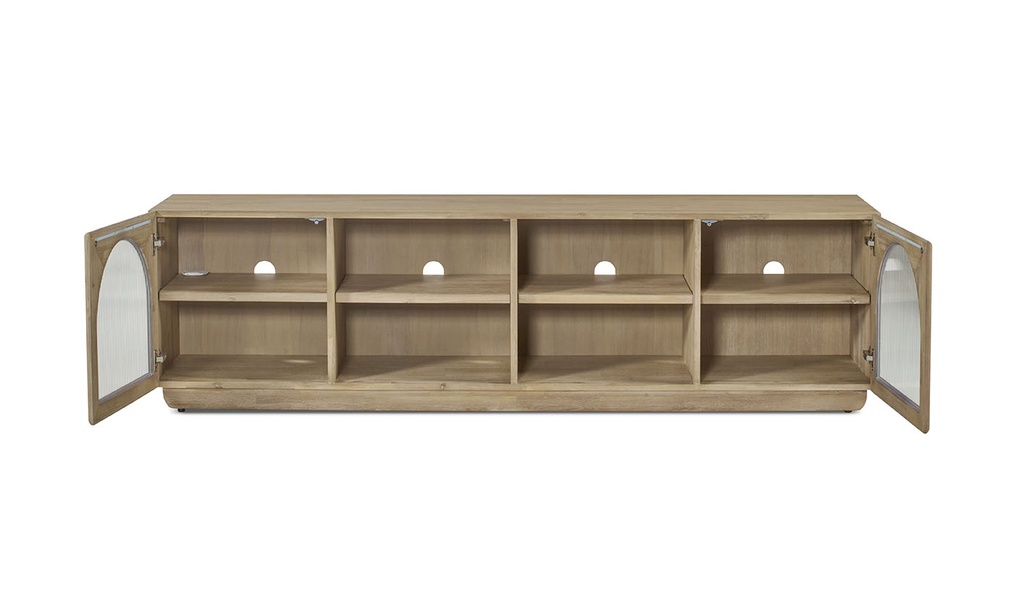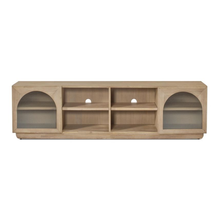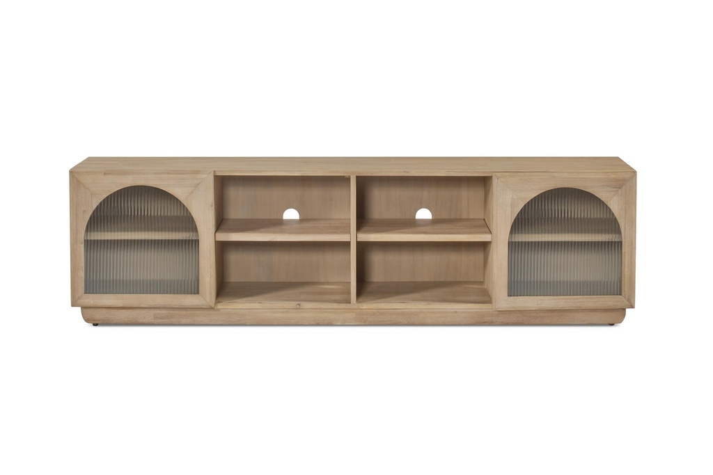 El Mueble TV Frida combina líneas limpias y un diseño natural con detalles curvos que aportan un toque distintivo. Fabricado en madera maciza, cuenta con dos puertas laterales con cristal estriado y amplios compartimentos centrales para dispositivos y almacenaje. Un mueble funcional y elegante que aporta calidez y estilo al salón.