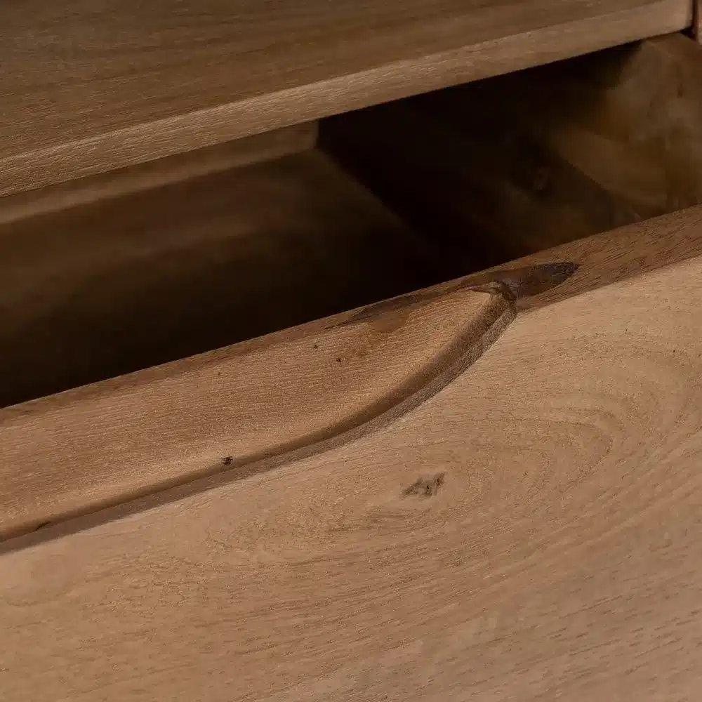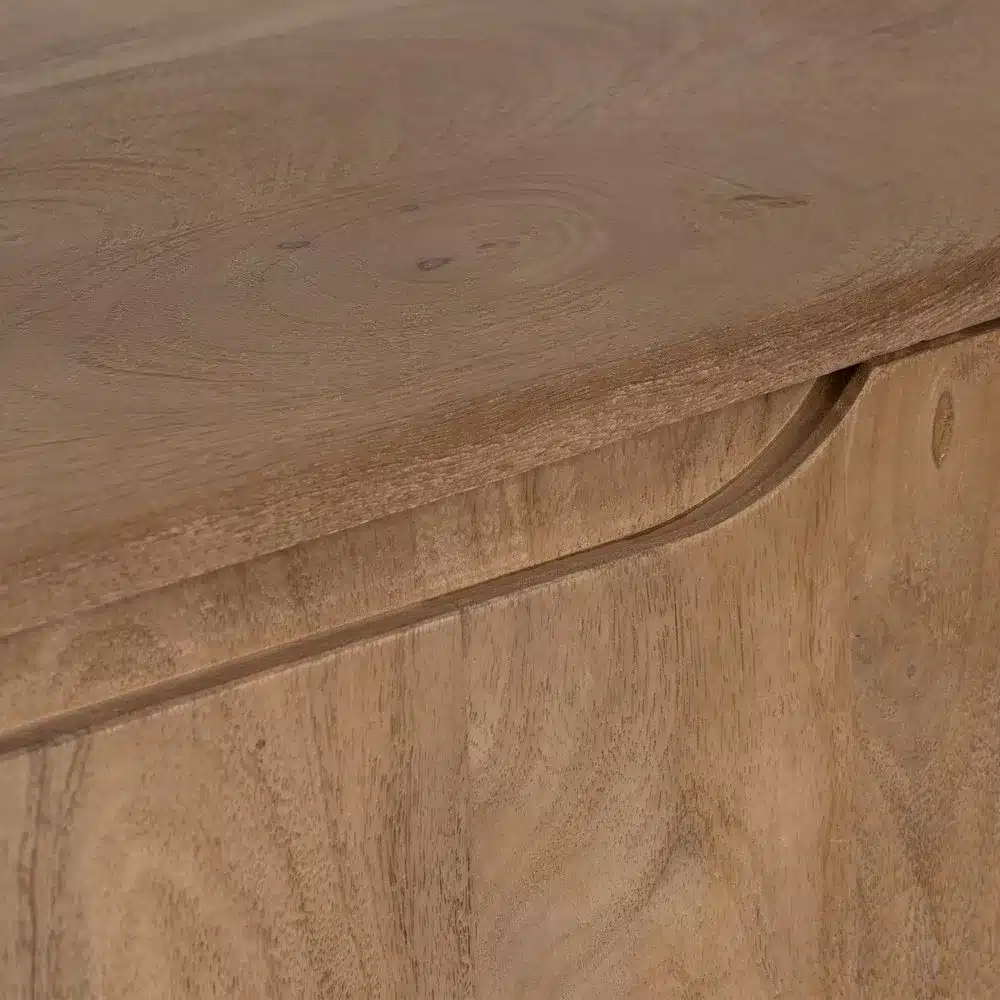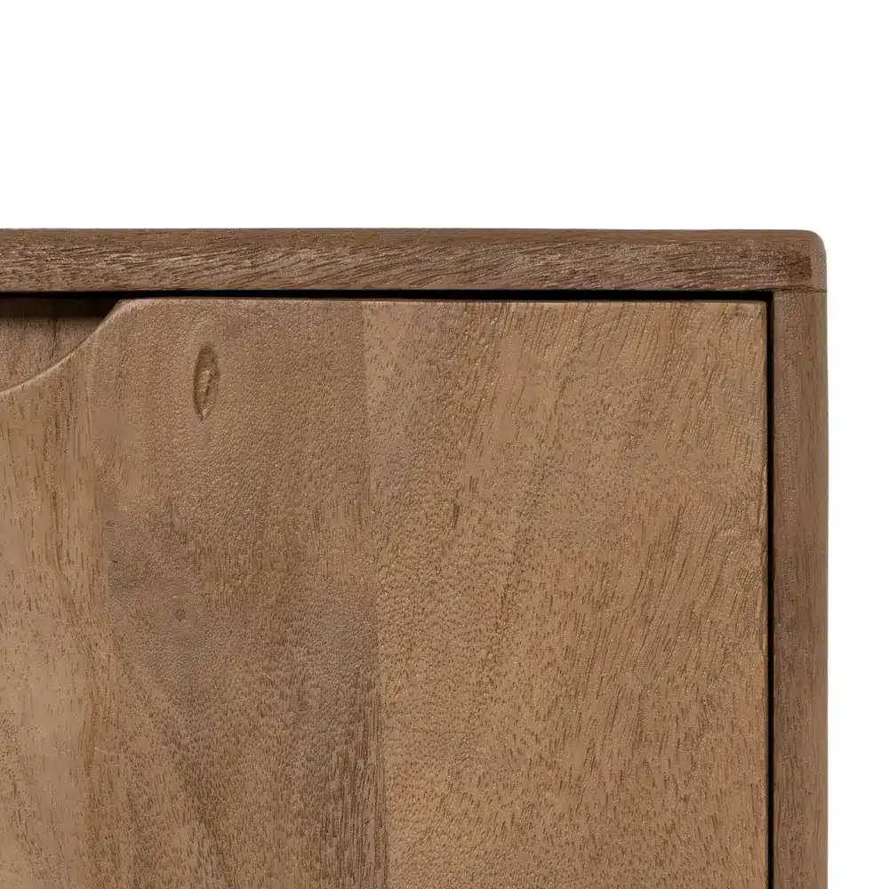 El Mueble TV Lanza destaca por su diseño limpio y contemporáneo en madera maciza de mango. Su tono natural y estructura robusta lo convierten en una pieza versátil y elegante. Dispone de dos puertas laterales, un cajón central y un hueco abierto para dispositivos multimedia.