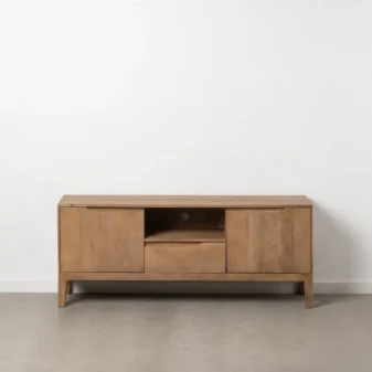 El Mueble TV Latola Madera combina elegancia y funcionalidad con un diseño contemporáneo de líneas suaves. Su estructura de madera de mango en tono marrón claro aporta calidez, mientras que la encimera de mármol blanco añade un toque sofisticado. Las patas metálicas en acabado dorado ofrecen estabilidad y estilo, haciendo de esta pieza el centro de atención del salón.