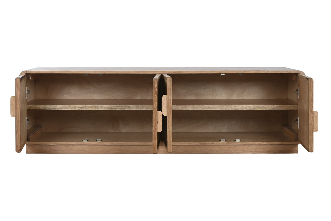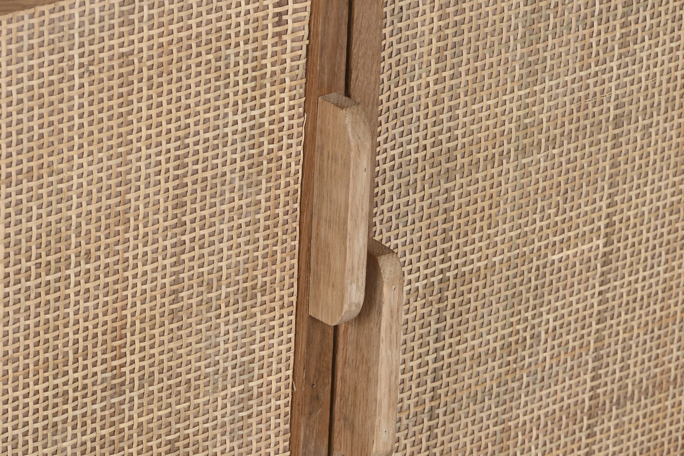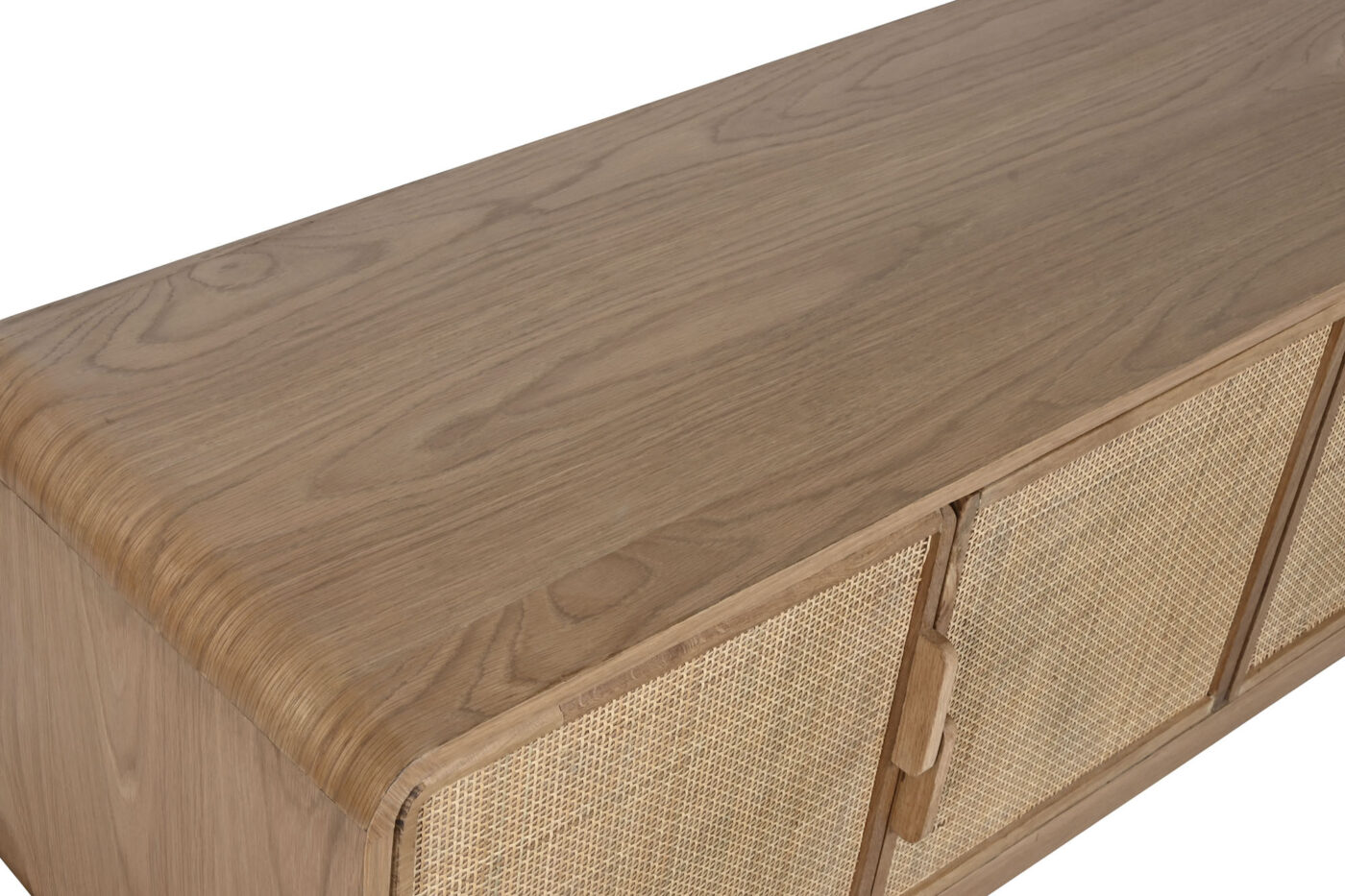 El Mueble TV Sushita combina la calidez del roble natural con la textura artesanal del ratán. Su diseño ligero y elegante, con cuatro puertas frontales, permite mantener el orden sin renunciar al estilo. Ideal para salones de estética mediterránea o natural.
