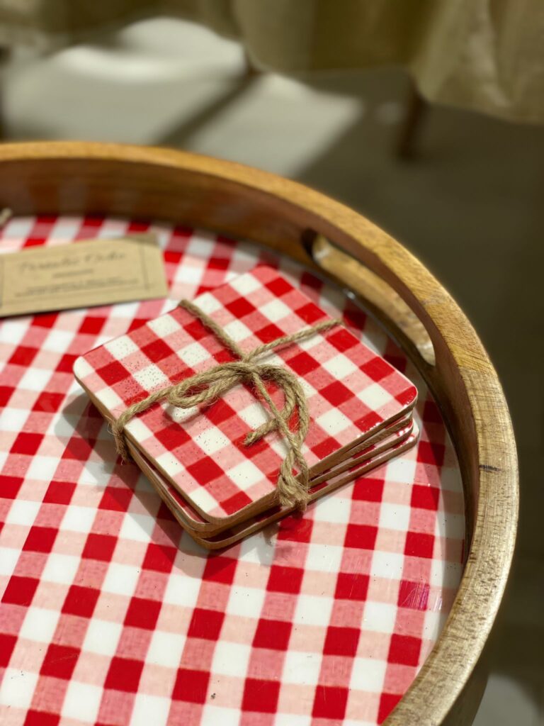 SET 4 POSAVASOS DE MADERA EN CUADROS ROJO VICHY, ESMALTADOS